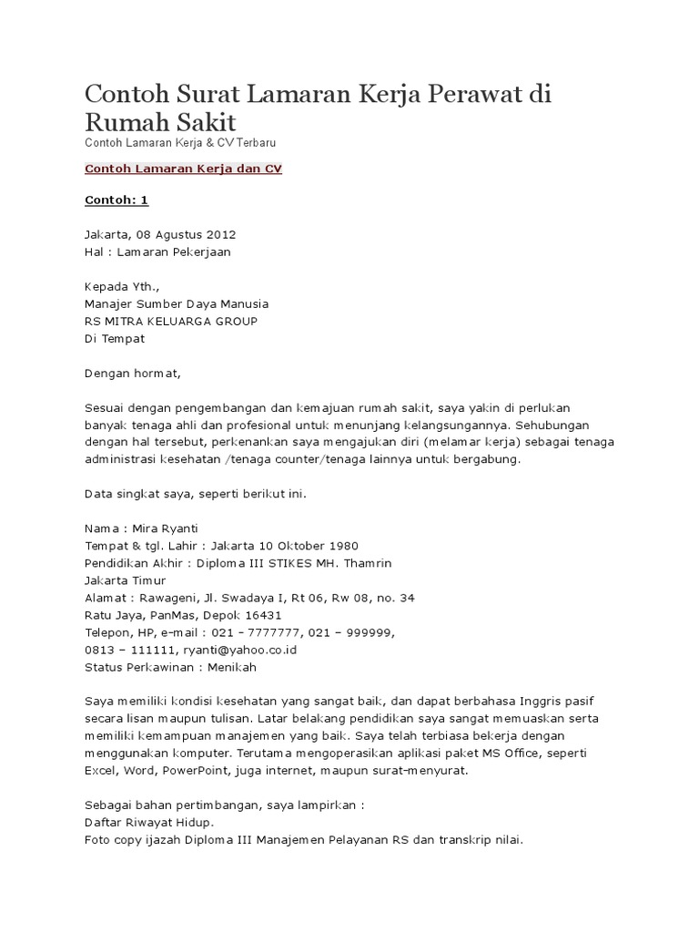 Contoh surat lamaran kerja dalam bahasa inggris contoh surat lamaran kerja rumah sakit. Berikut adalah beberapa contoh surat lamaran kerja di rumah sakit berbagai posisi dan jabatan yang bisa anda pergunakan sebagai bahan referensi.