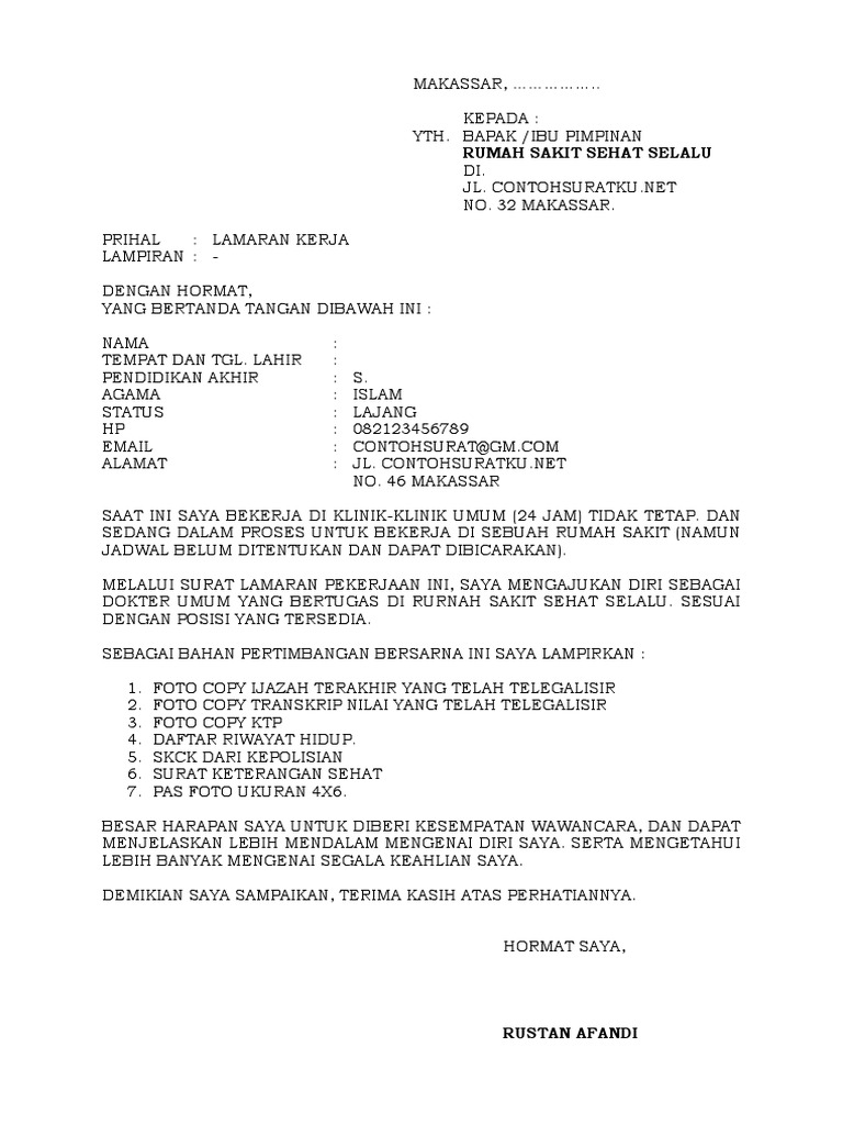 Contoh surat lamaran kerja di perusahaan umum i. Agar anda bisa bekerja di rumah sakit untuk sebuah posisi tertentu, pastinya anda harus melamar pekerjan terlebih dahulu. Sampai saat ini profesi guru masih sangat dimunati. Contoh surat lamaran kerja di rumah sakit. 25 contoh surat lamaran kerja pada postingan kali ini semoga dapat membantu anda yang berjuang mencari kerja demi kehidupan yang lebih baik. Menyiapkan berkas dan persyaratan lamaran kerja. Cara mengirim surat lamaran kerja via email. Dengan hormat, yang bertanda tangan di bawah ini Panduan cara membuat surat lamaran kerja surat lamaran kerja ini tentu akan sangat dibutuhkan bagi anda yang akan melamar pekerjaan. Contoh surat lamaran kerja yang baik dan benar. Contoh surat lamaran kerja di rumah sakit. Surat lamaran kerja merupakan salah satu syarat untuk mendapatkan pekerjaan yang ingin anda dapatkan. Surakarta, 7 juni 2016 kepada yth.